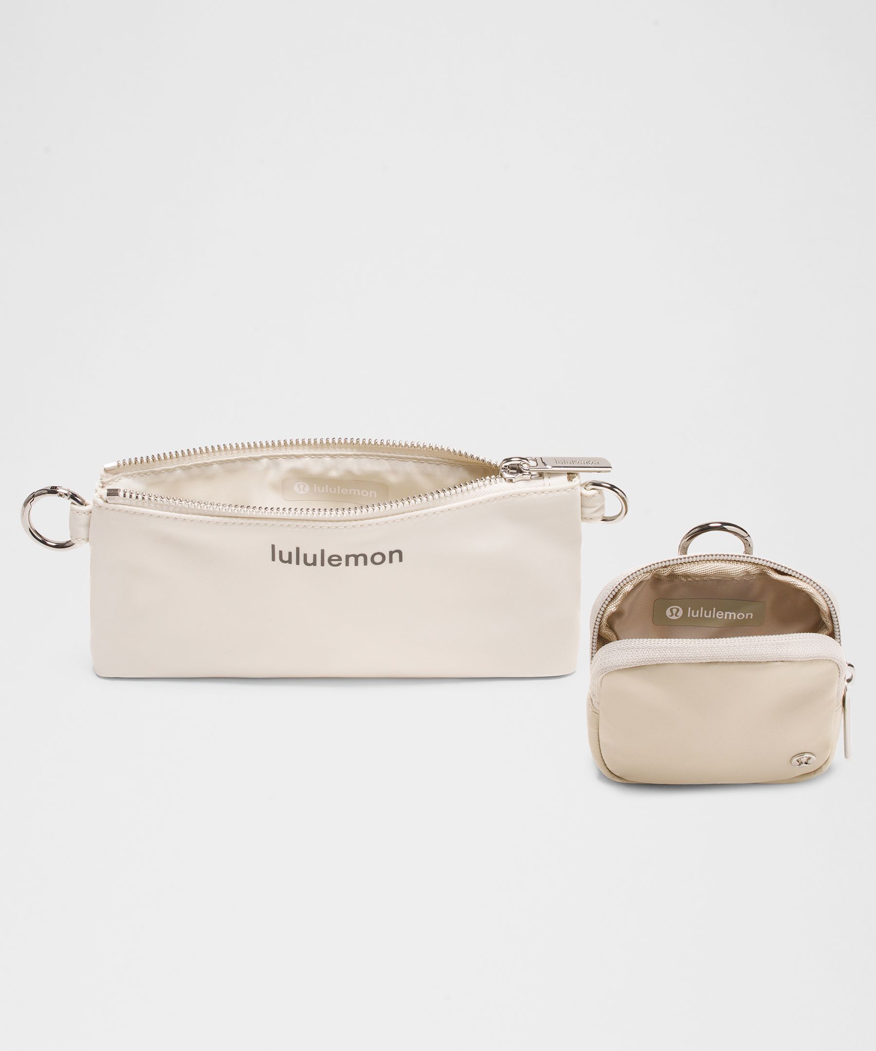 - Both pouches have zippered main compartments